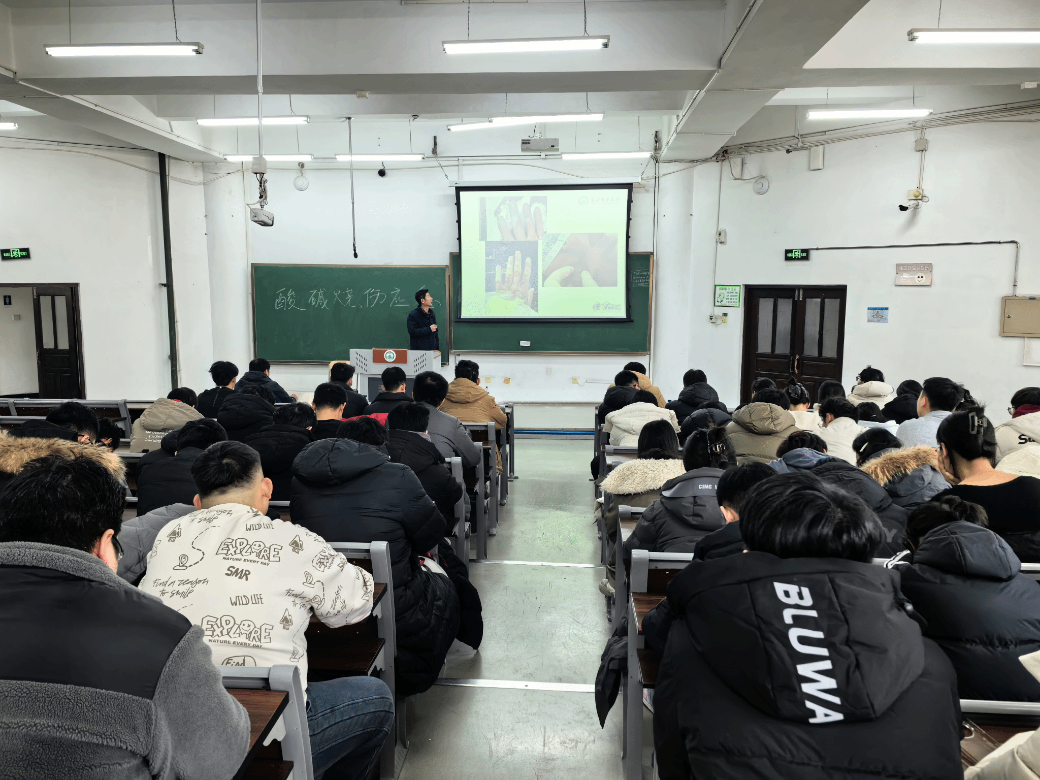 本次培训及演练特别邀请了学院杨迎军老师作为主讲人,杨老师为同学们重点讲解了实验室常见的风险之一:酸碱烧伤的应急处置措施。他从原理入手,结合实际案例,详细阐述了不同类型化学烧伤的特点,并系统演示了“冲、脱、泡、盖、送”等关键急救步骤,强调了事发初期的“黄金处理时间”对于减轻伤害的决定性作用。杨老师的讲解深入浅出,实用性强,有效纠正了同学们可能存在的一些认知误区和操作陋习。