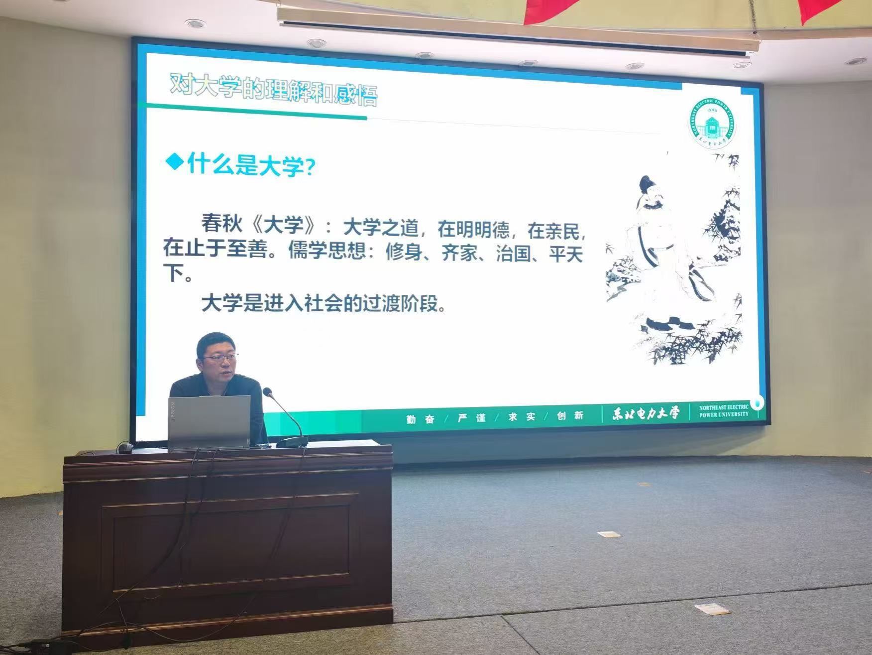 课程伊始,高鹏代表学院向来自五湖四海的新生们表示热烈欢迎。接着,高鹏围绕“什么是大学”“如何过好四年大学生活”“对如何成为一名学生党员的忠言”,深刻阐释了大学的演变与职责,全面展现了我校办学历史与成就,生动解读了新时代青年的努力方向与使命担当,给全体新生上了一堂鲜活的思想政治理论课。