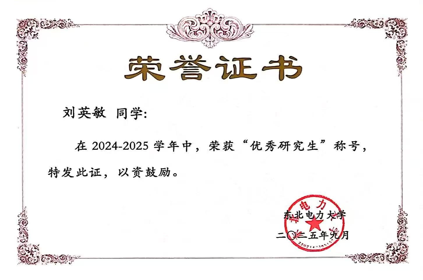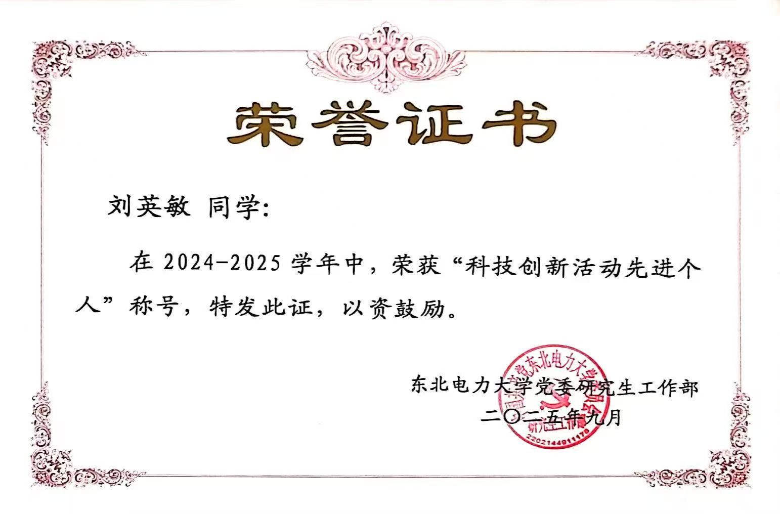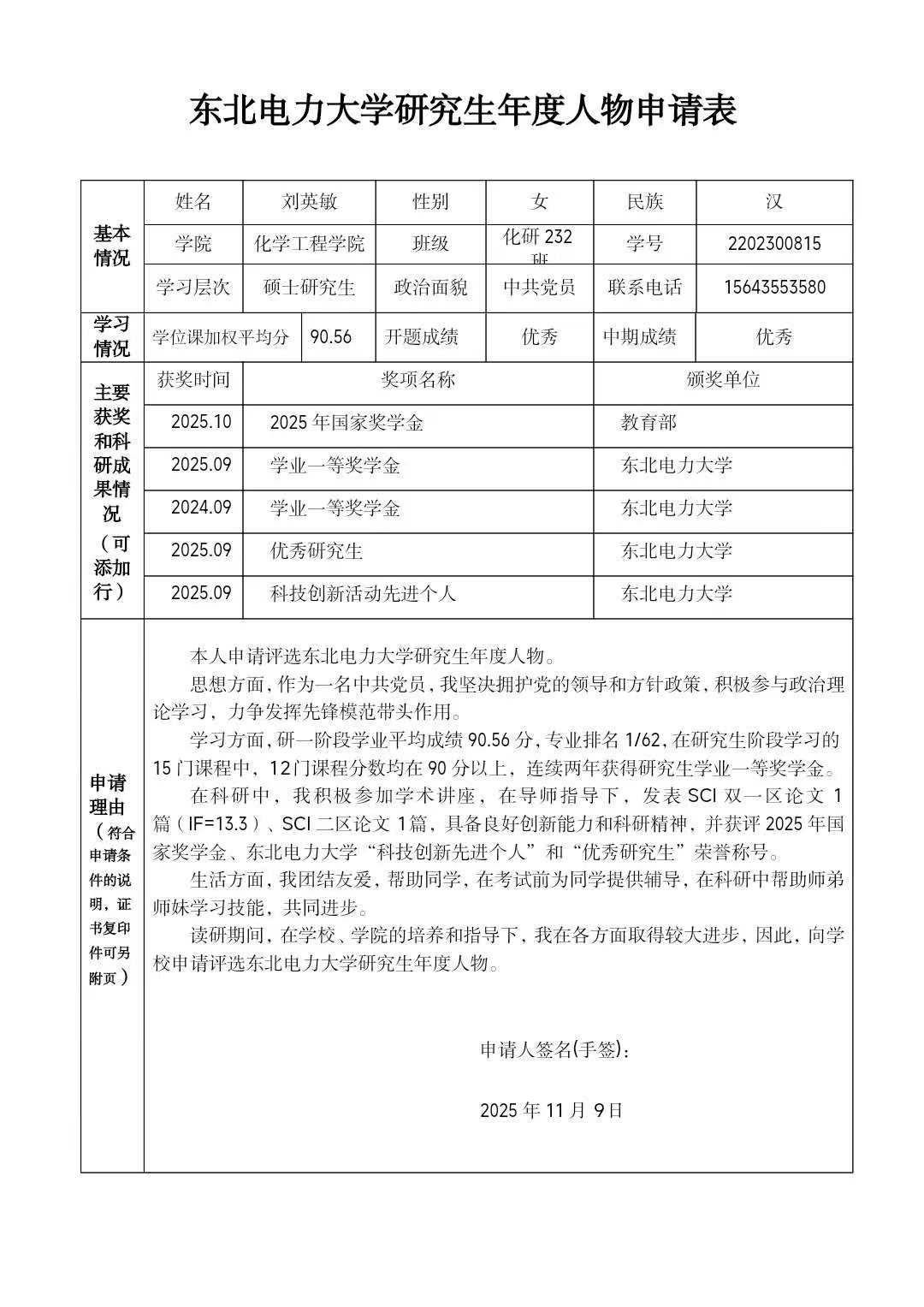 刘英敏,女,汉族,2001年8月出生,中共党员,东北电力大学应用化学专业2023级硕士研究生。入学以来,我始终以高标准严格要求自己,勤奋学习、勇于实践、敢于探索、乐于奉献,锚定“科技创新服务工业安全”初心,将“勤奋、严谨、求实、创新”的校训融入学业成长、学术科研与社会实践的每一个环节。连续两年获得东北电力大学研究生学业一等奖学金,获评2025年国家奖学金,获得东北电力大学“优秀研究生”、“科技创新活动先进个人”荣誉称号。
